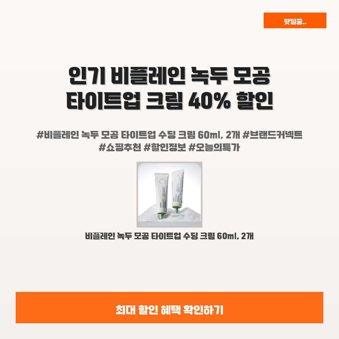 🛍️ 이 포스팅은 네이버 쇼핑 커넥트 활동의 일환으로,판매 발생 시 수수료를 제공받습니다.오늘 소개할 제품은 단언컨데,,그야말로 비플레인 녹두 모공 타이트업 수딩 크림 60ml, 2개예요!모공 문제로 고민하시는 분들, 혹시 제 피부처럼 고민하고 계신가요?비플레인 녹두 모공 타이트업 수딩 크림은 많은 이들에게 숨겨진 비밀 같은 제품이랍니다.이 크림은 피지 조절과 수분 공급을 동시에 해결해줘서, 매일매일 부담 없는 피부로 만들어줄 수 있어요.진심으로, 여러분도 이 멋진 변화의 주인공이 되어보세요!게다가 지금 놀라운 40% 할인으로 만나볼 수 있다는 사실!놀랍게도 정가 52,000원이 31,200원으로 염가에 제공된답니다. 수많은 후기들이 이를 증명해 주고 있어요!※ 이거 진짜 제가 직접 써보고 쓰는 리뷰예..